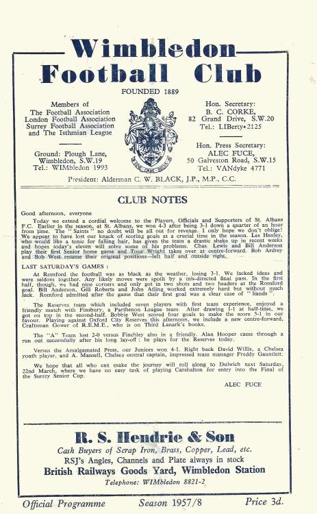 Wimbledon Eric Adams (?), Brian Martin (?) 2 - 1 St. Albans City