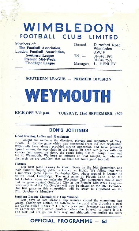 Wimbledon Gerry O'Rourke (?) 1 - 0 Weymouth