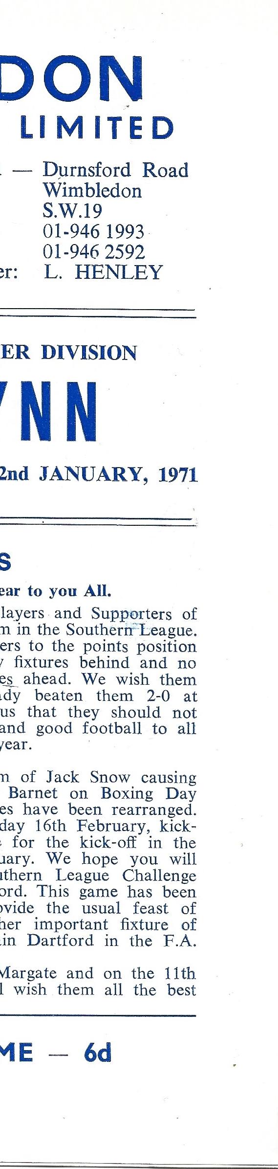 Wimbledon Ian Cooke (?), Roy Law (?) 2 - 1 King's Lynn