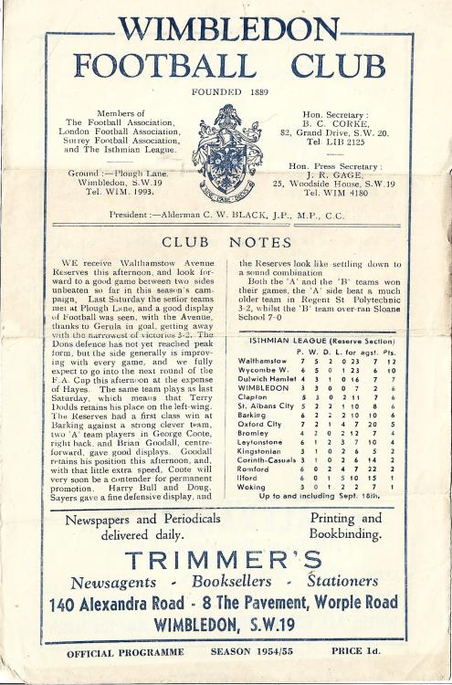 Wimbledon (reserves) ? 2 - 2 Walthamstow Avenue (reserves)