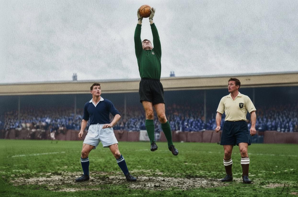 On This Day in 1959 Alan Burton watches Ilford goalkeeper Paddy Gibbons catch the ball as the Dons' narrow, 2-1 win puts them level on points with Isthmian League leaders Wycombe Wanderers. With attendances as amateur grounds across the country dropping alarmingly, Plough Lane was bucking the trend.