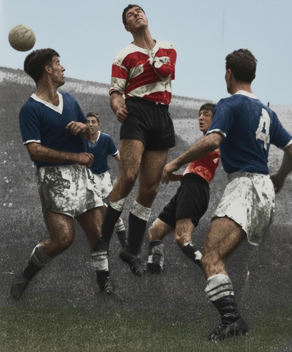 On This Day in 1960 Ks skipper Jimmy Coates climbs above Jim Wright and Bobby Ardrey during the Dons' 5-0 London Senior Cup victory over Kingstonian. Somehow mastering the swamp-like conditions and ignoring the barracking he regularly received from the terraces, Eddie Reynolds led the line brilliantly and scored four times. The list of first team goalscorers showed how reliant Wimbledon had become on their much-maligned centre forward - he had scored 26 goals in the first half of the campaign with Norman Williams and Brian Martin next with just five each. Click article to enlarge Introduction