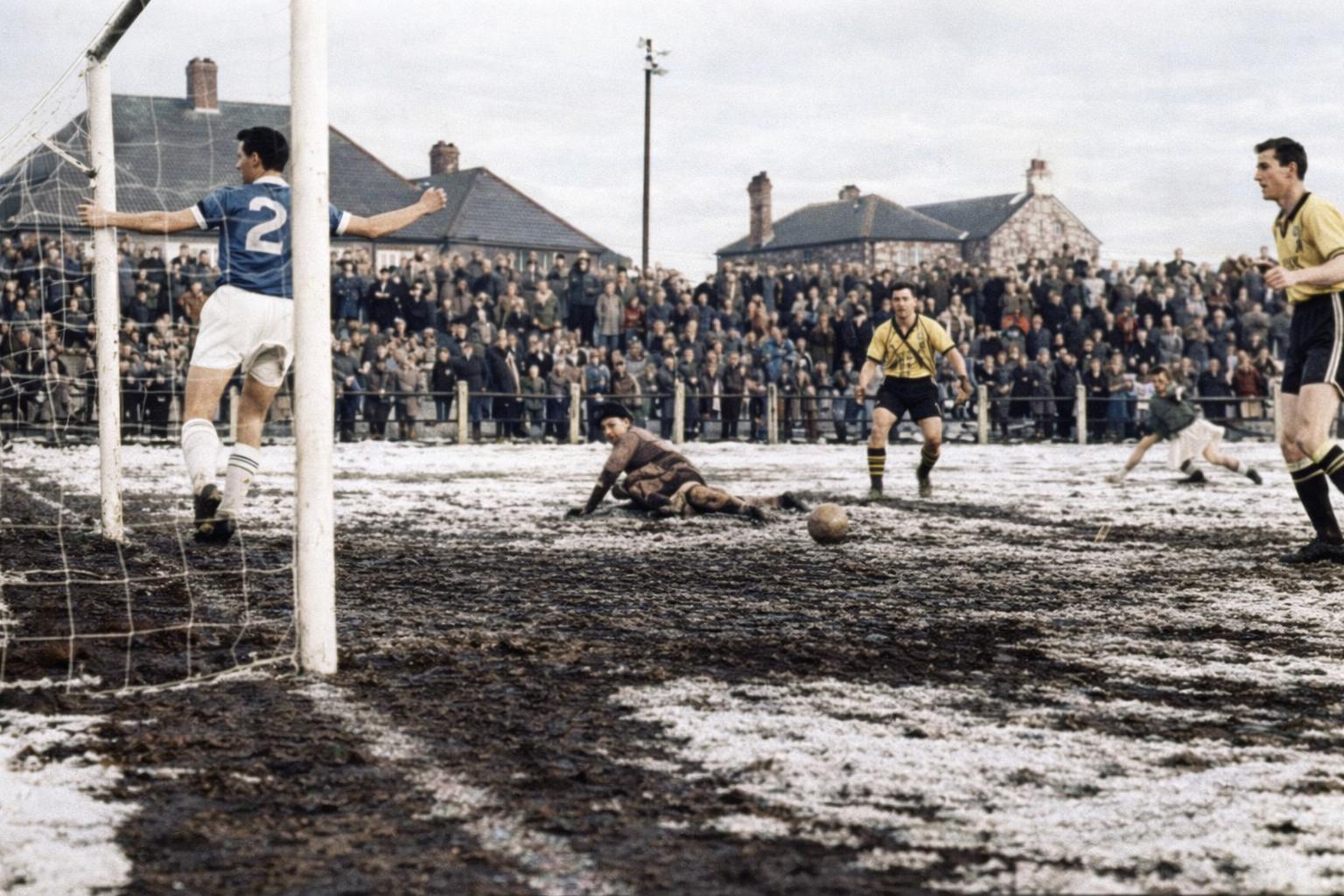 On This Day in 1962 With snow covering much of the rutted Millfield playing surface, John Martin (No 2) cannot prevent Arnold Coates firing Crook Town ahead in an FA Amateur Cup quarter final tie. The Northern Leaguers were on top from the start and only a fine display from 'keeper Eddie McAlpine kept the score line respectable. "The pitch was in a terrible state, and the match would never have been played today," supporter Pete Nyman recalled. "As Enfield were playing at West Auckland Town we shared a special train north." For the third year in a row, the Dons had gone out to the eventual winners. Click article to enlarge Introduction