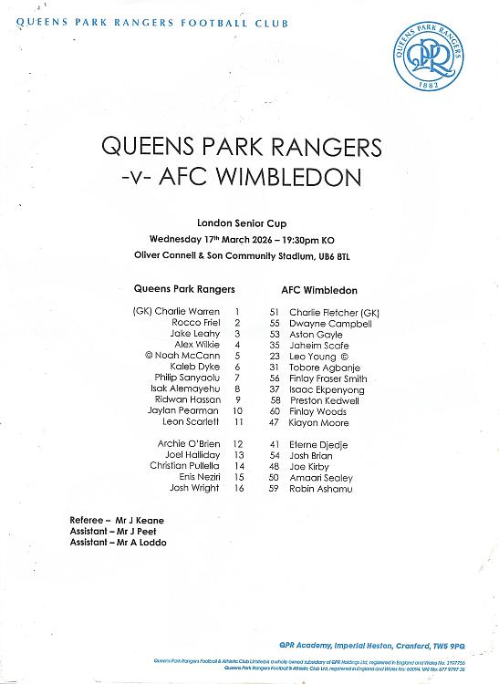 Queens Park Rangers (u21s) ? 4 - 1 AFC Wimbledon (u18s)