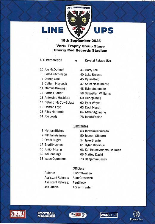 Wimbledon Joe Lewis (45), Antwoine Hackford (74), Kai Jennings (87) 3 (1) - (0) 1 Crystal Palace (u21)